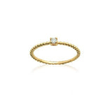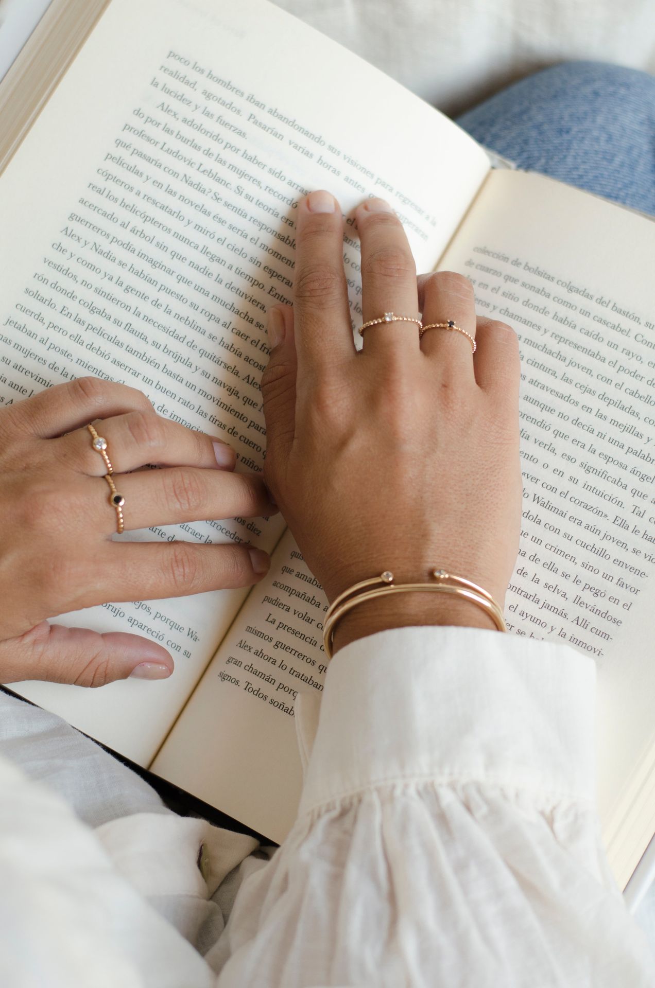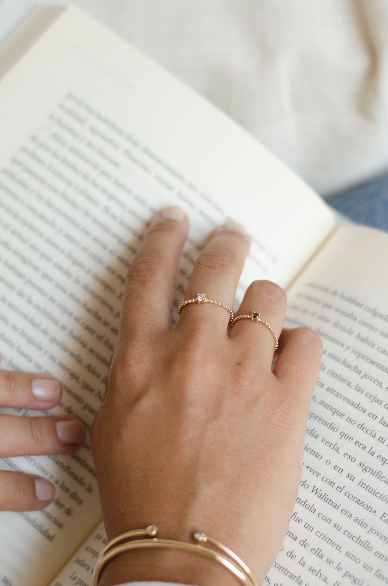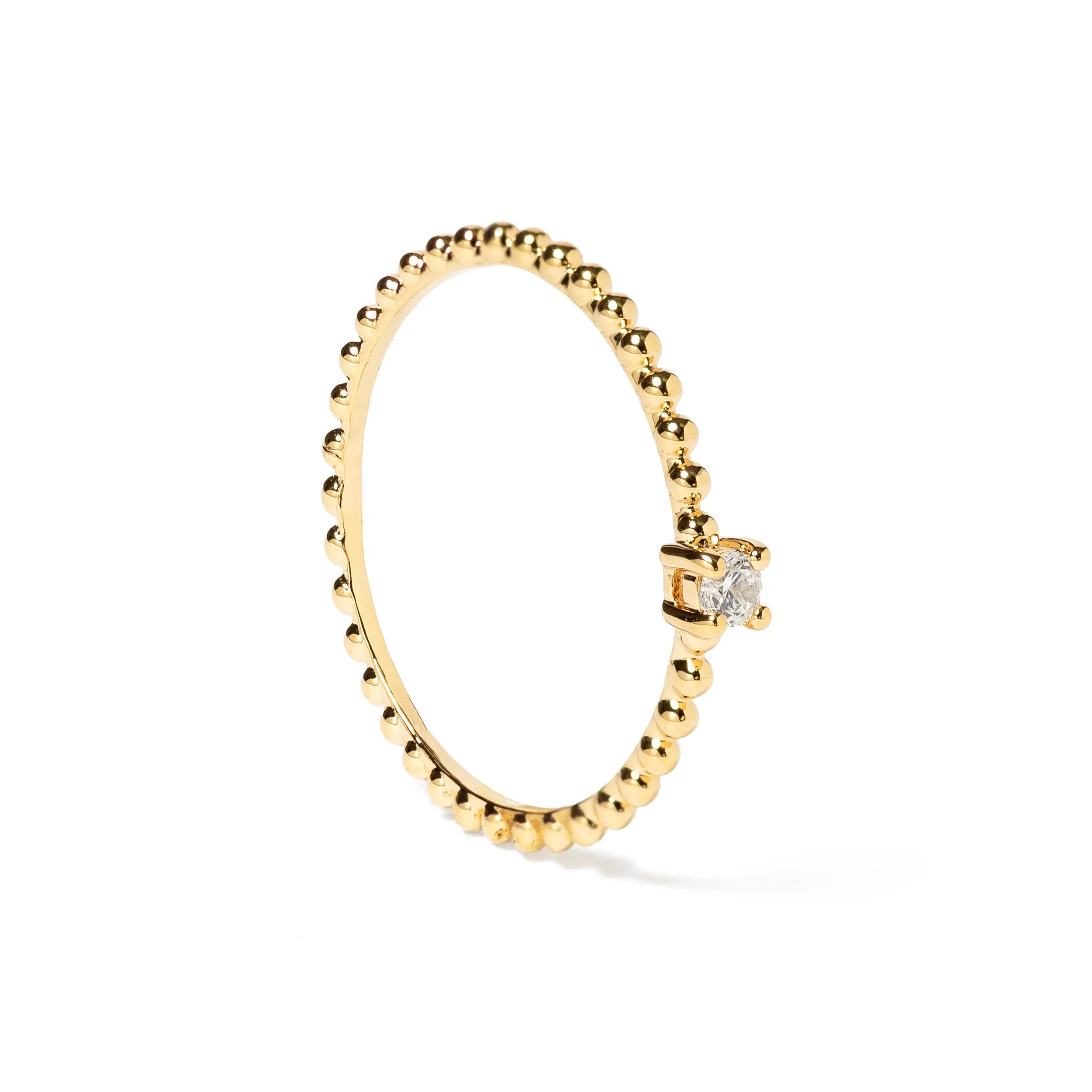 El anillo Anouck White es un producto único, elaborado con materiales de primera clase. Hecho a base de latón, con 3 micras de chapado de oro de 18 kts., una pequeña circonita blanca en el centro, engarzada, y todo bordeado por bolitas. Luce un estilo notable y desborda elegancia.