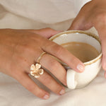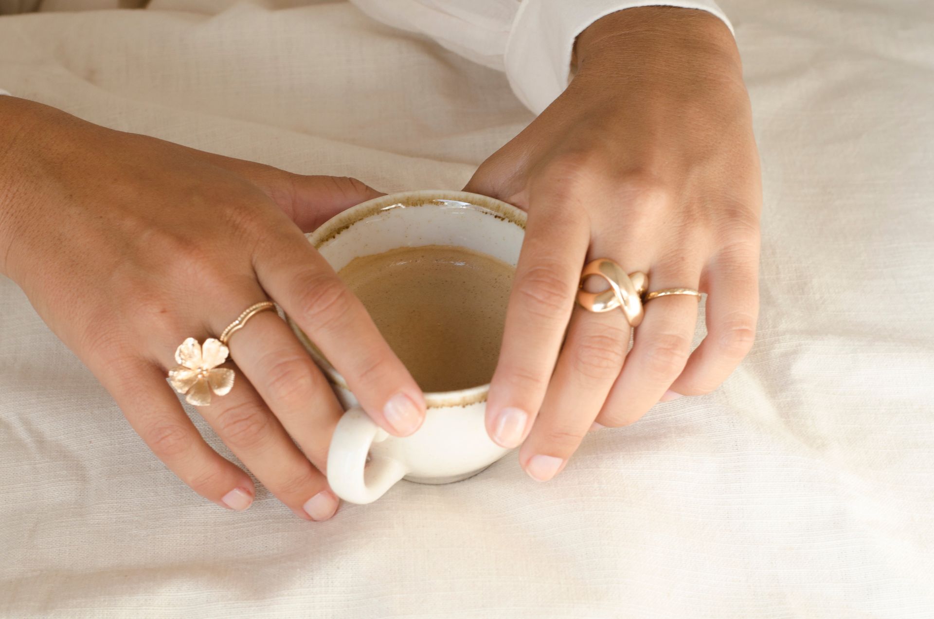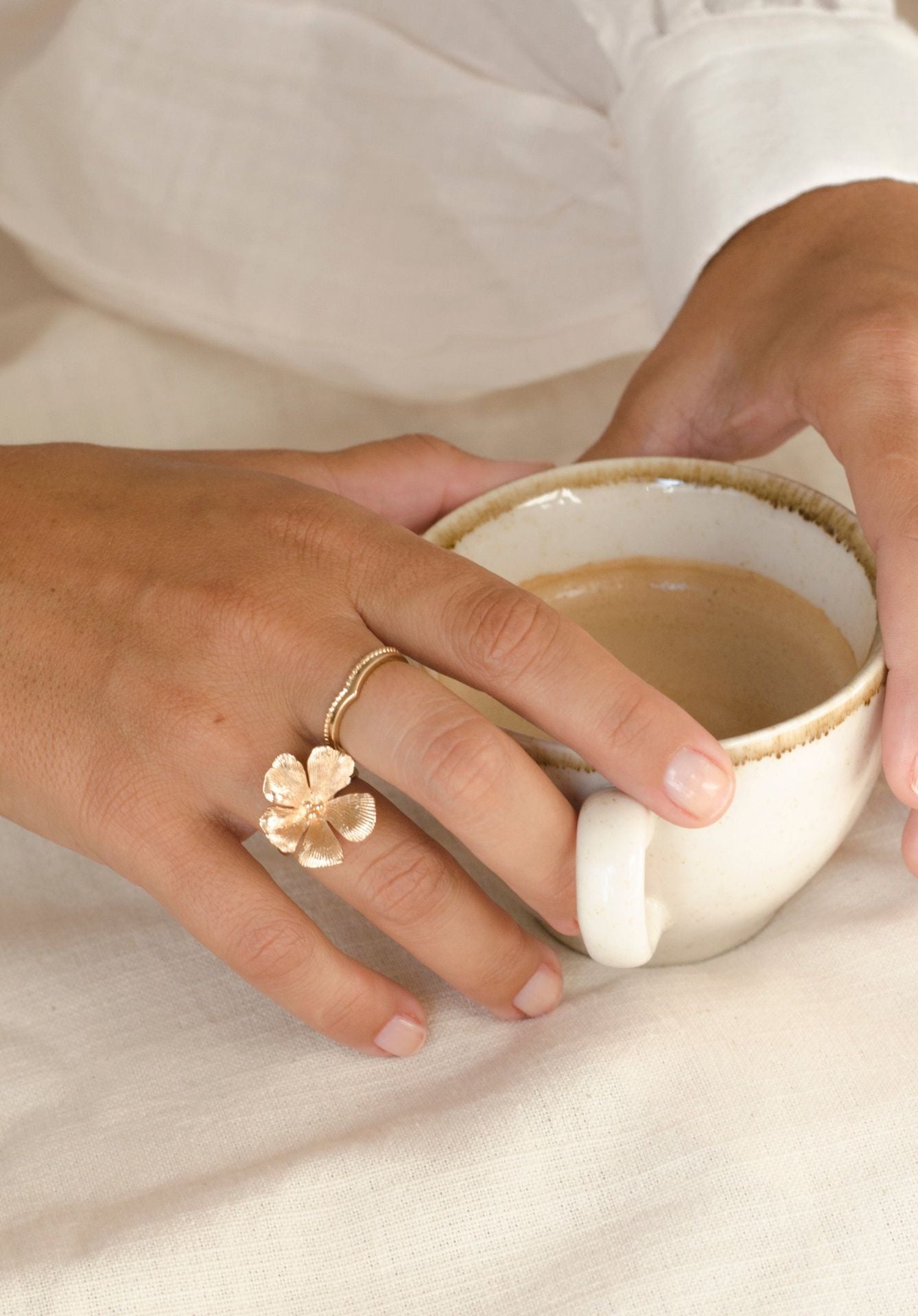 Anillo ASTRID, hecho de latón chapado en oro de 18 kts, con forma triangular y decoración con motivos étnicos. Nuestro diseño exclusivo es perfecto para completar tu look con un toque moderno que refleja la última tendencia. Disfruta de la calidad y elegancia del latón y el oro de 18kts.