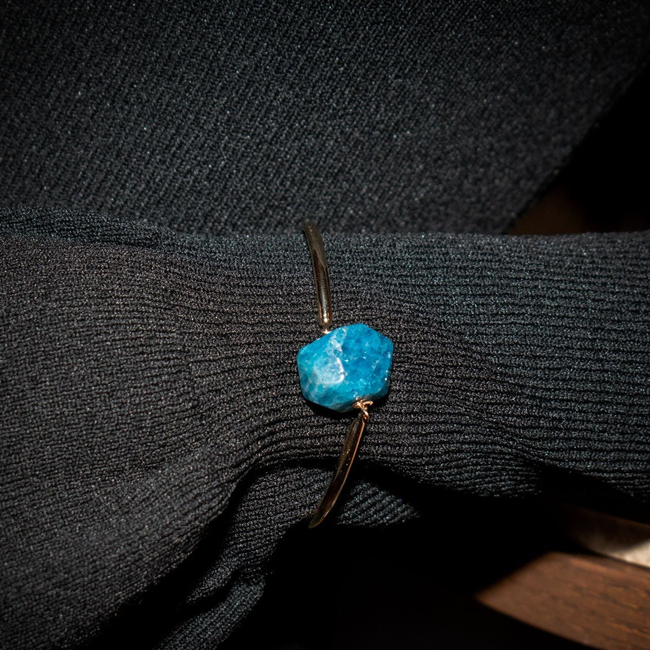 El Brazalete Bridget es una pulsera rígida que tiene una piedra natural apatita en el centro.