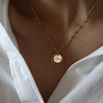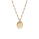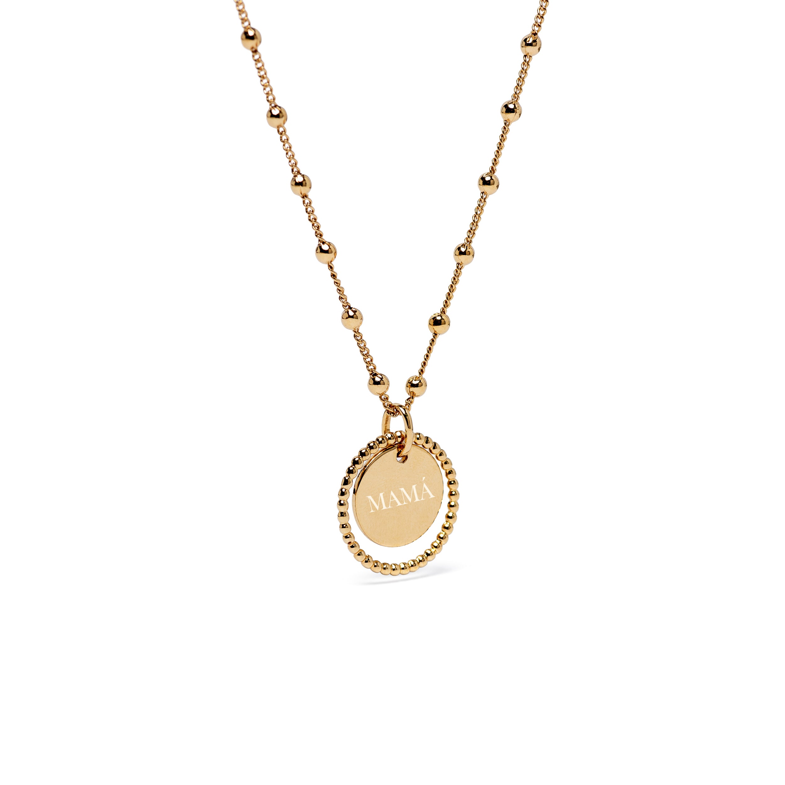 El collar Andrea Bolitas está formado por una cadena de bolitas acompañada de una placa con un aro de bolitas unidas.