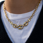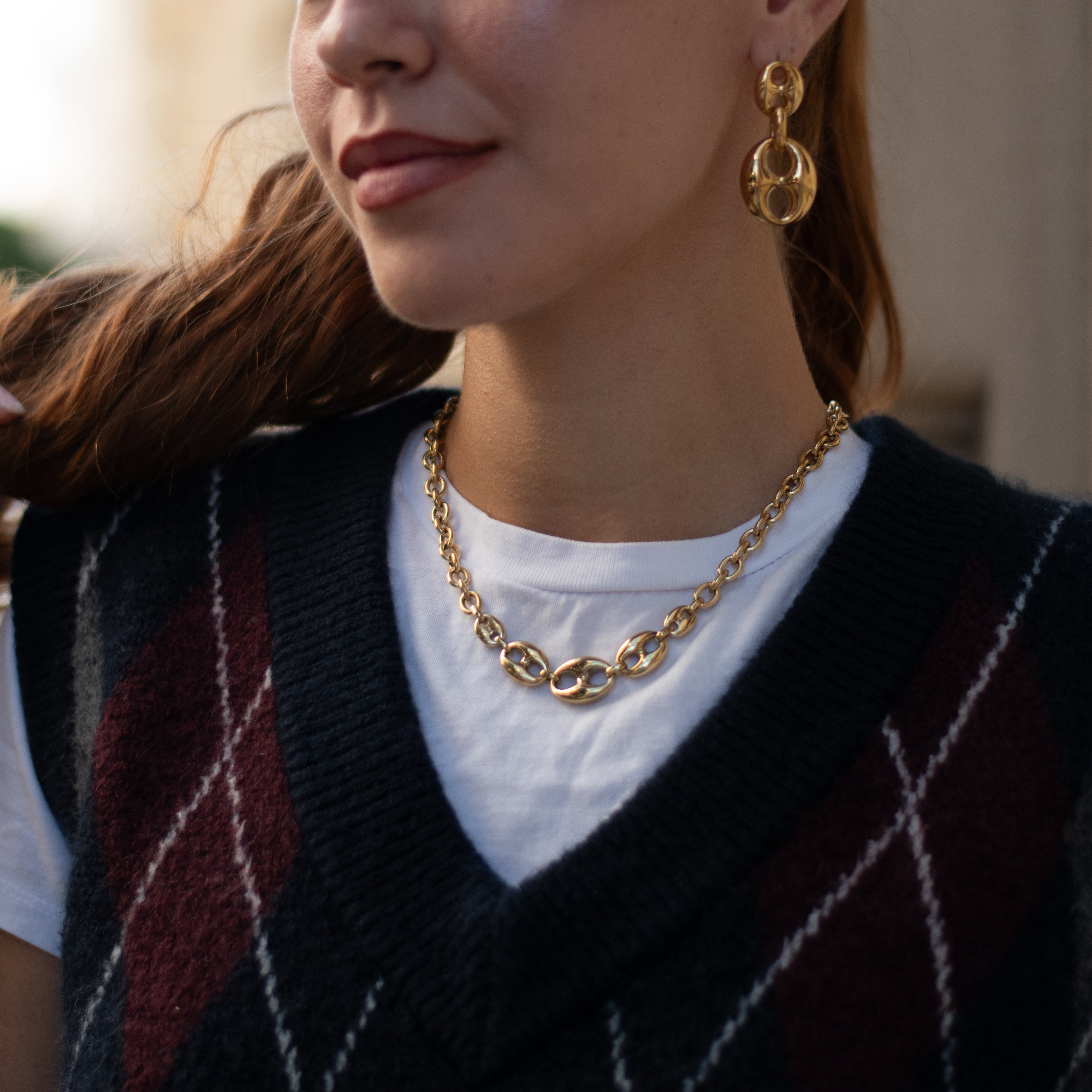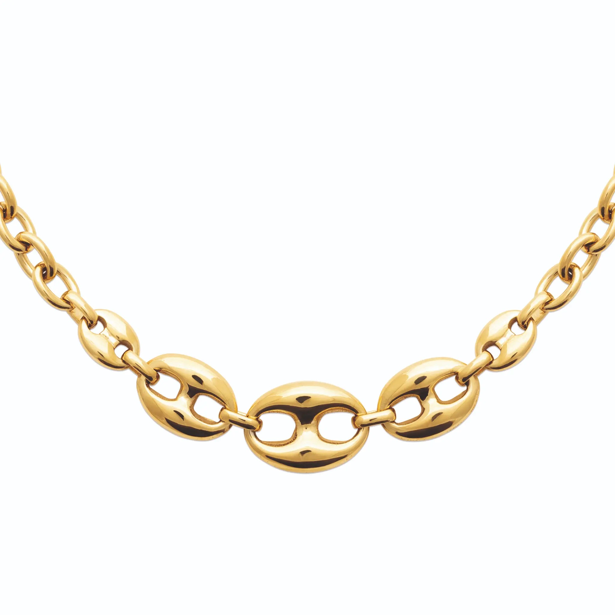 El collar Brote de la colección Steel, está formado por eslabones redondeados unidos unos a otros. Combínalo con su pulsera y sus pendientes a juego.