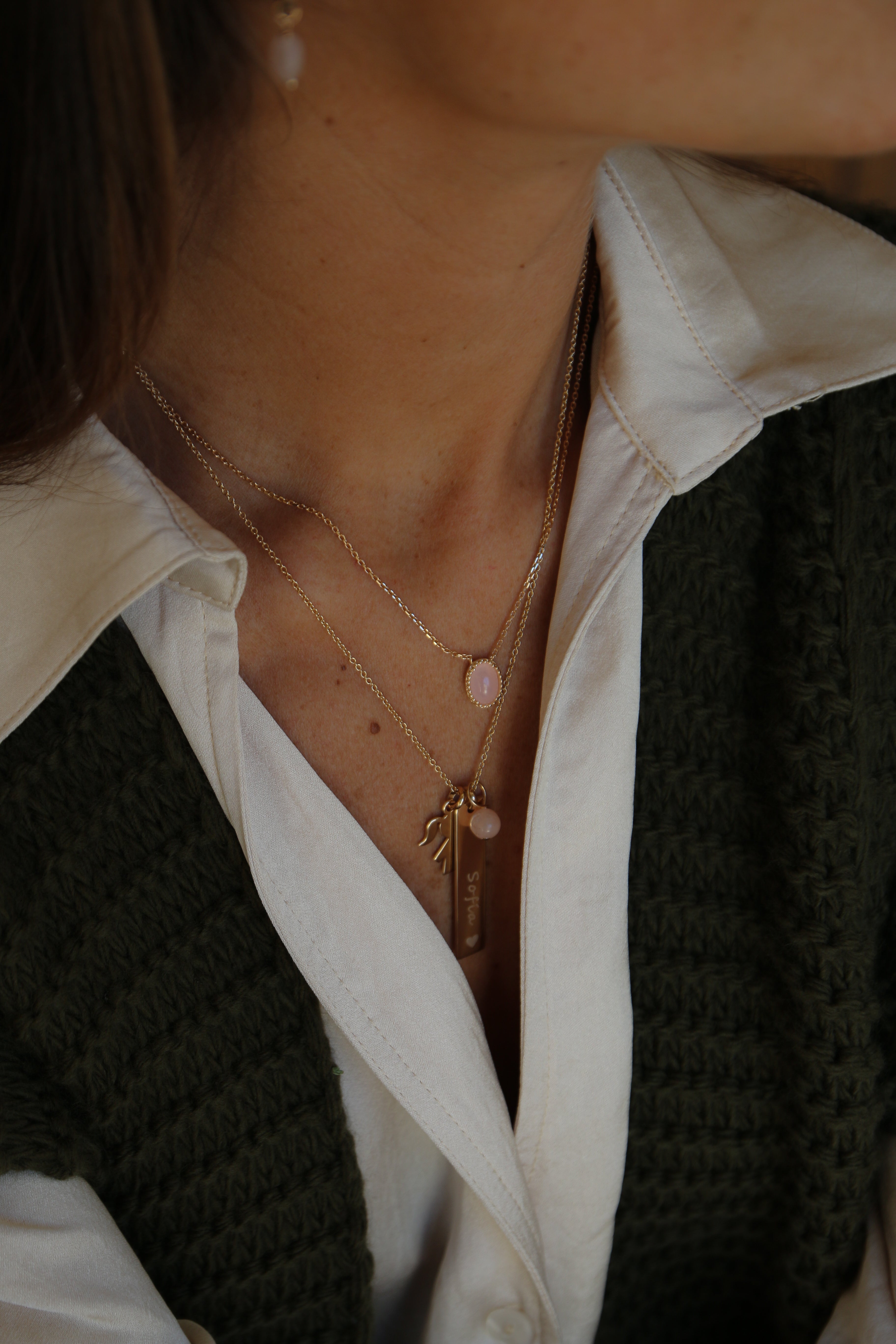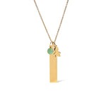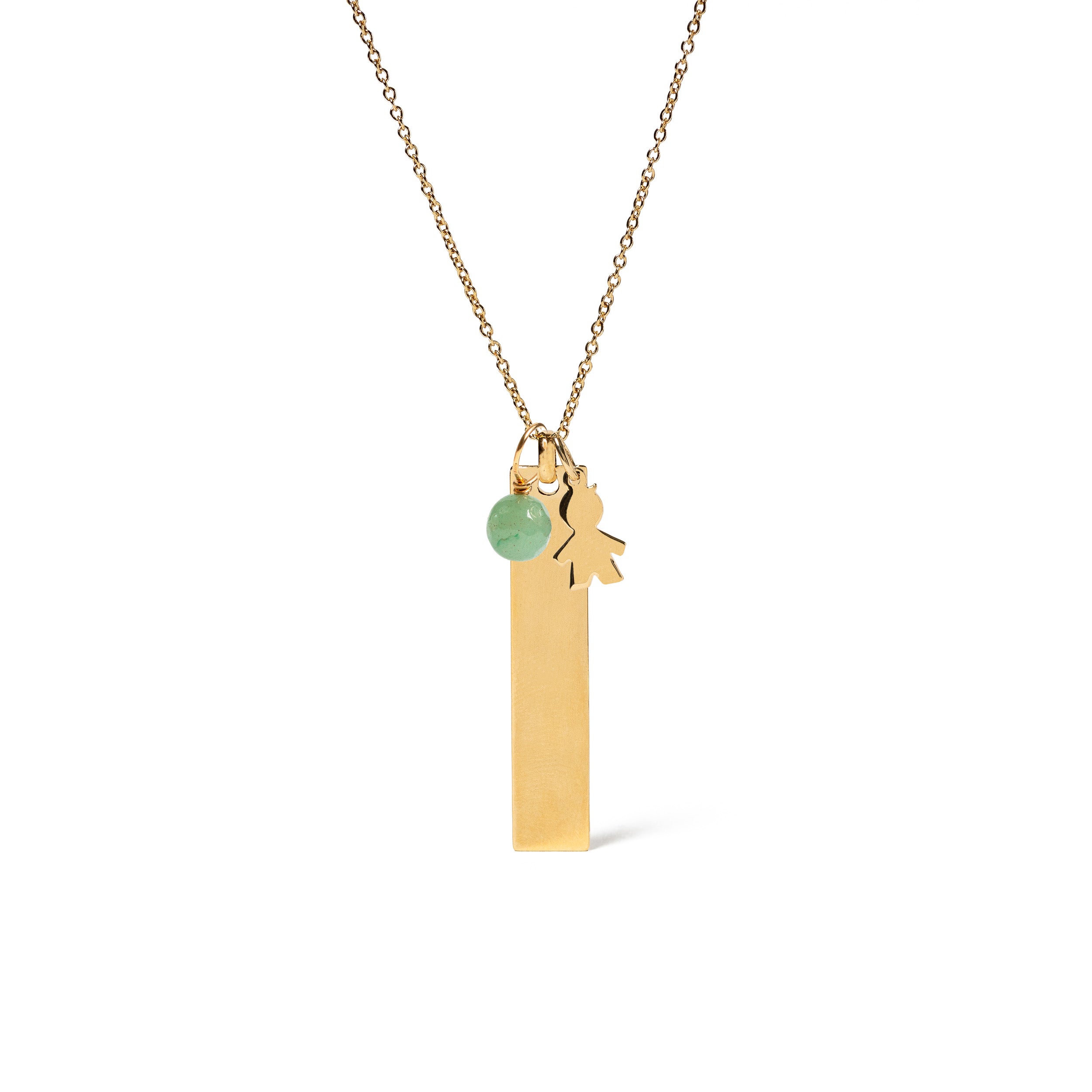 El collar Rectágulo Boy está formado por una cadena ajustable, una placa rectángular alargada que se puede personalizar , un colgante con la silueta de un niño y un charm de jade verde.