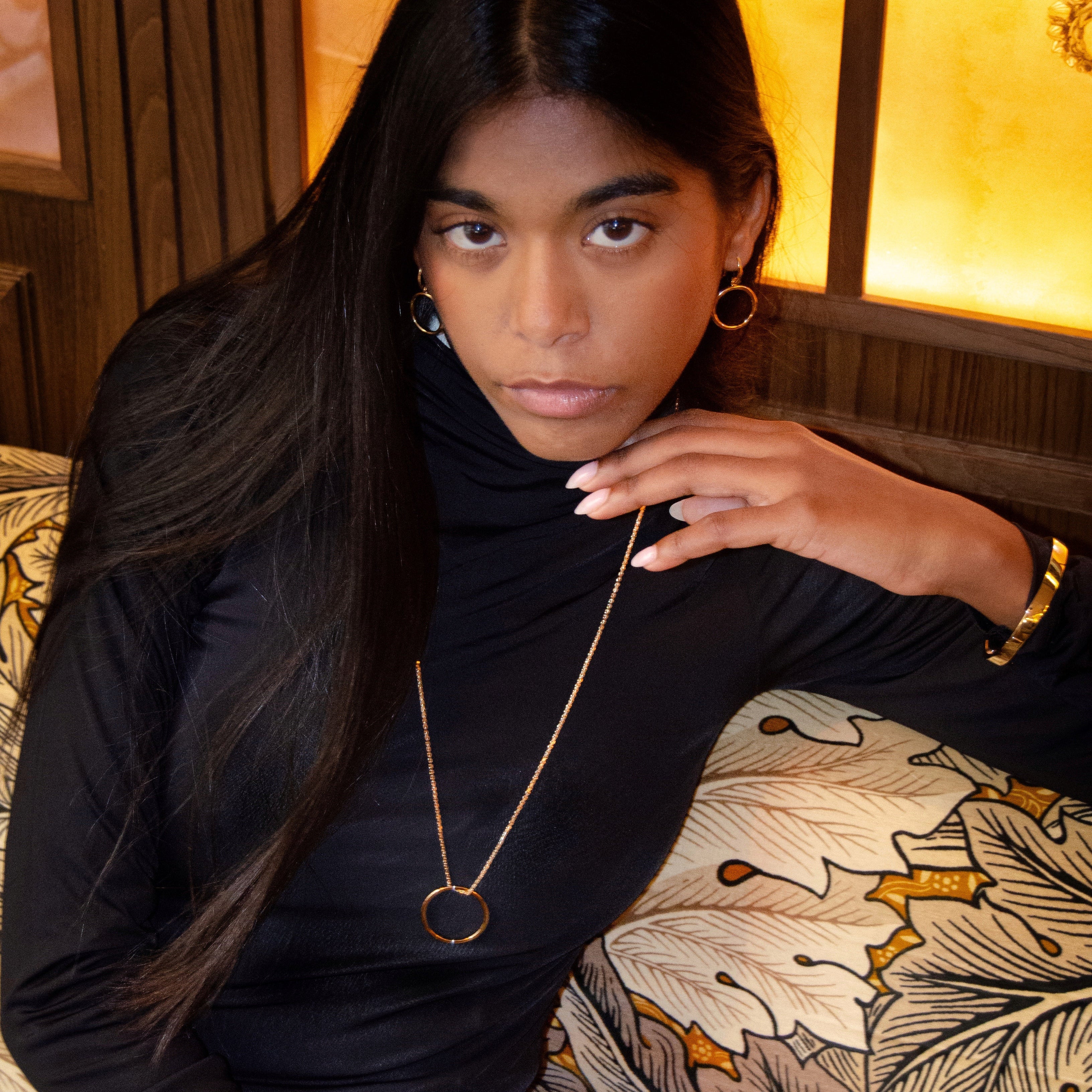 Matilda golden es un collar alargado formado por una cadena y un aro a modo de colgante.