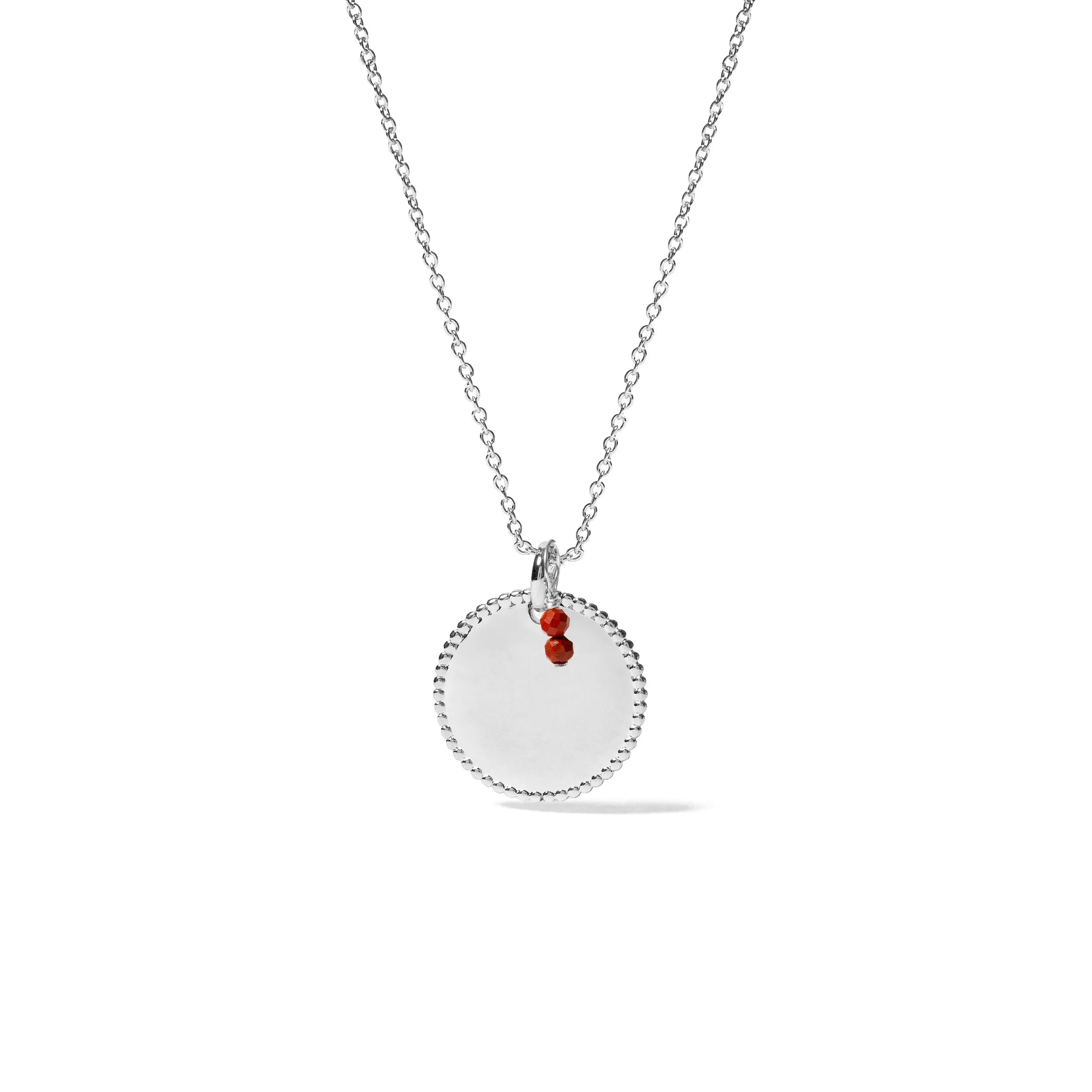 El collar Victoria Stone está formado por una cadena, una placa con el borde de bolitas  personalizable y la posibilidad de añadirle un charm de piedra natural.