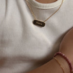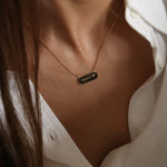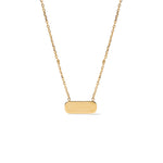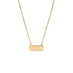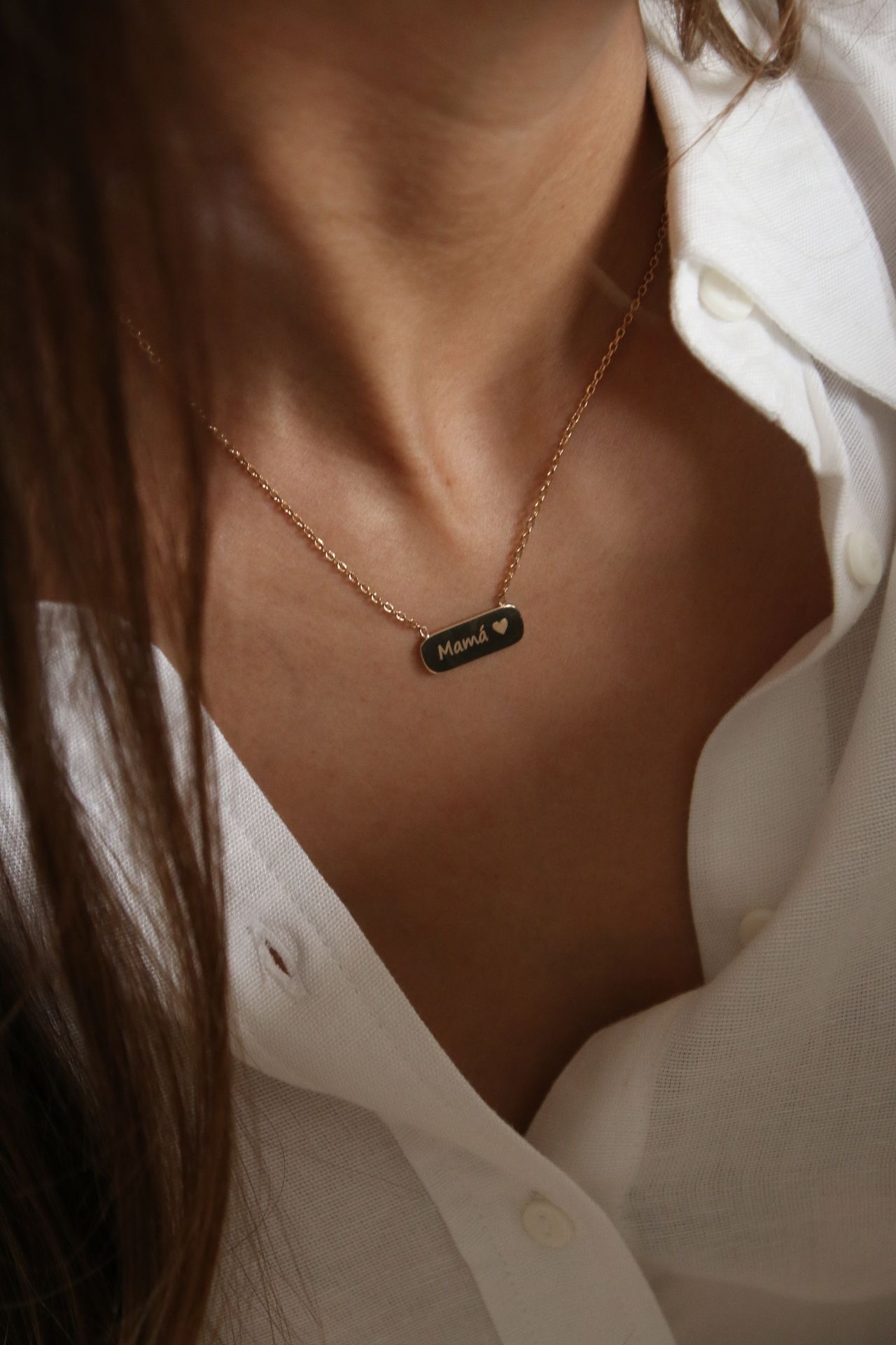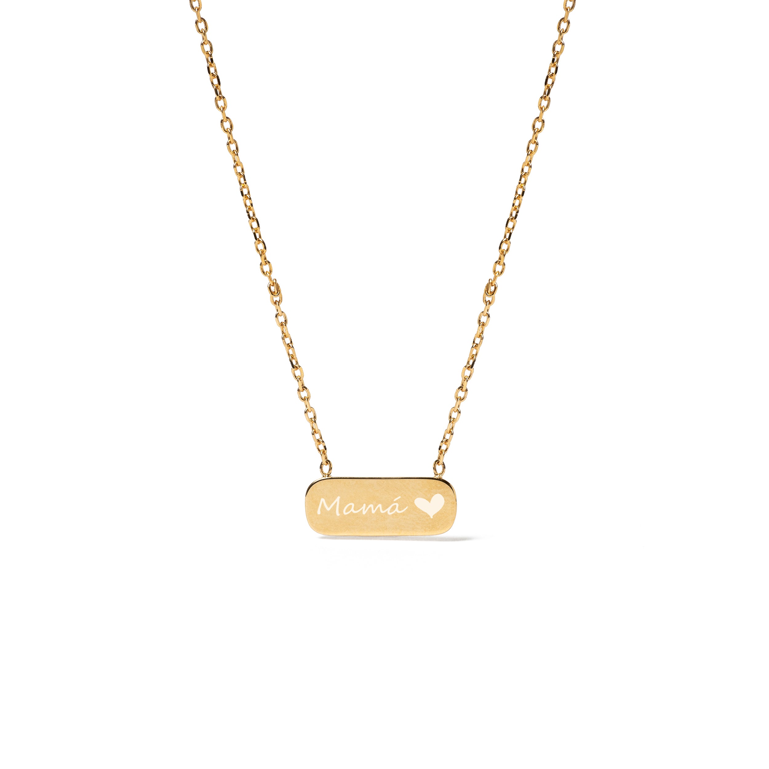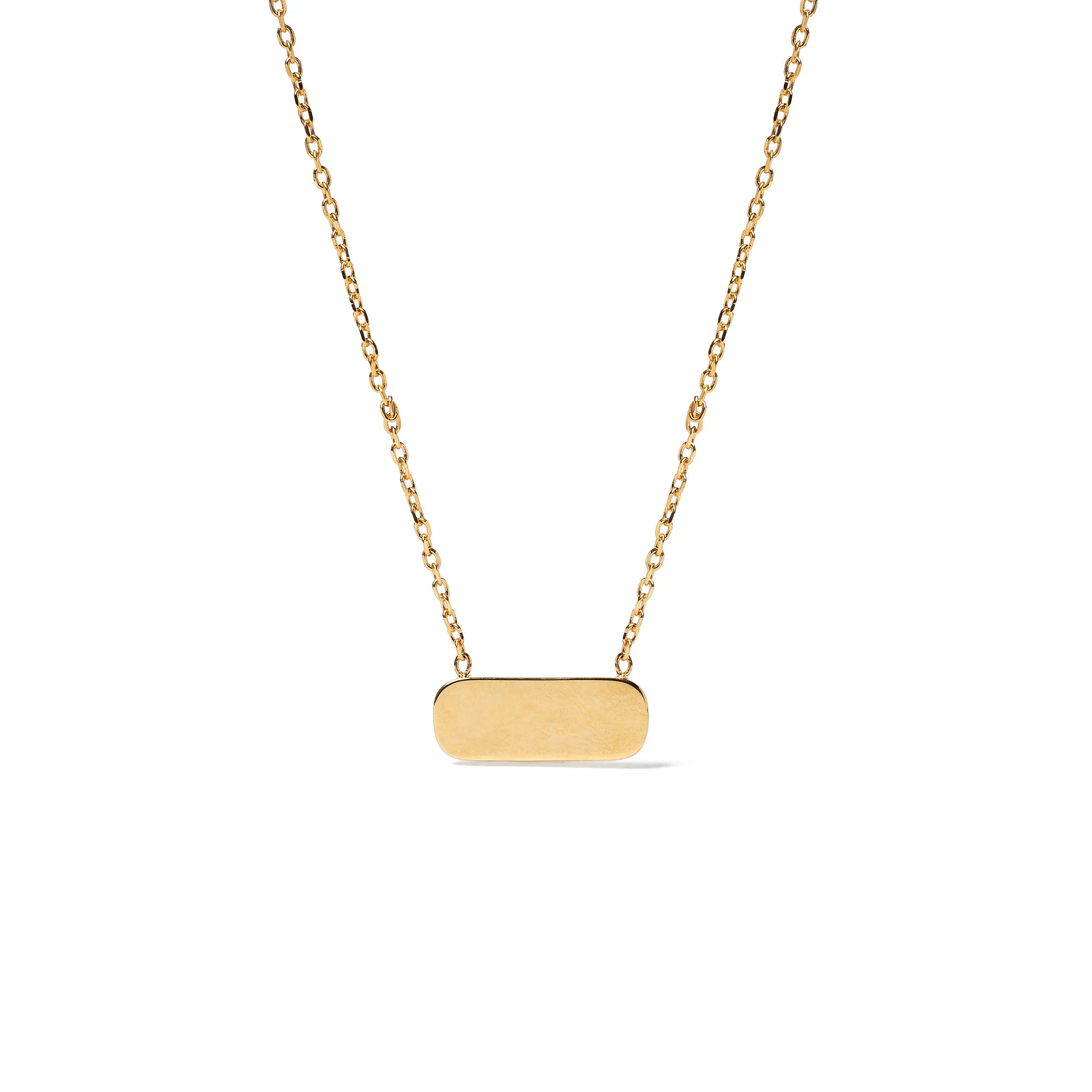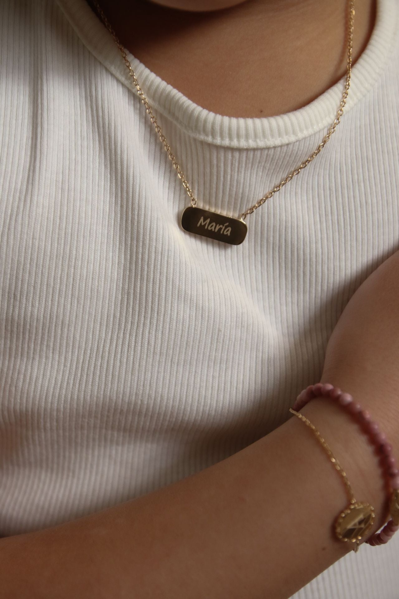 La gargantilla María está formada por una cadena ajustable unida a una placa rectángular con los bordes redondeados.
