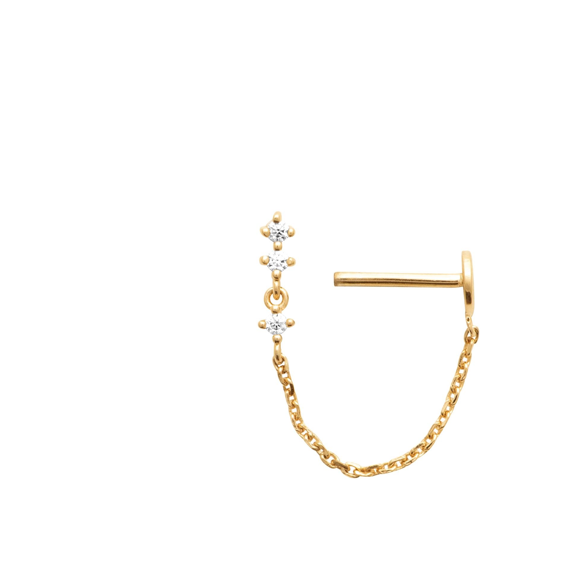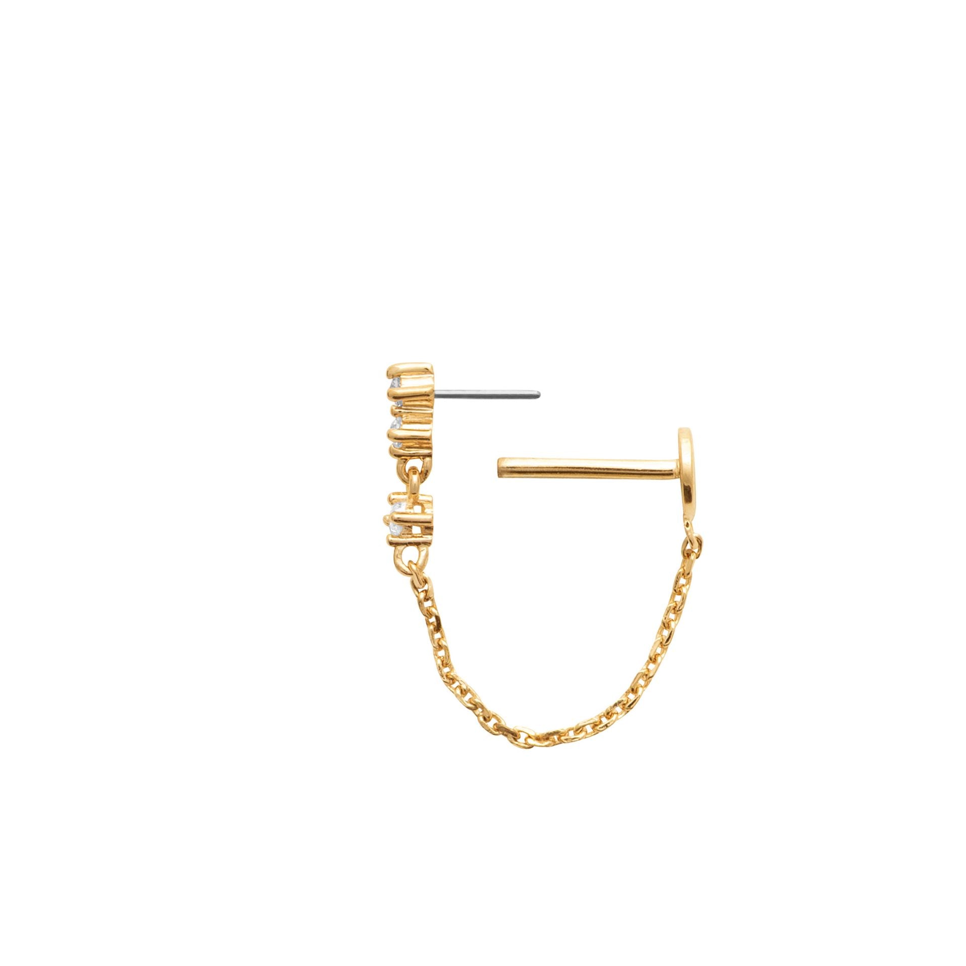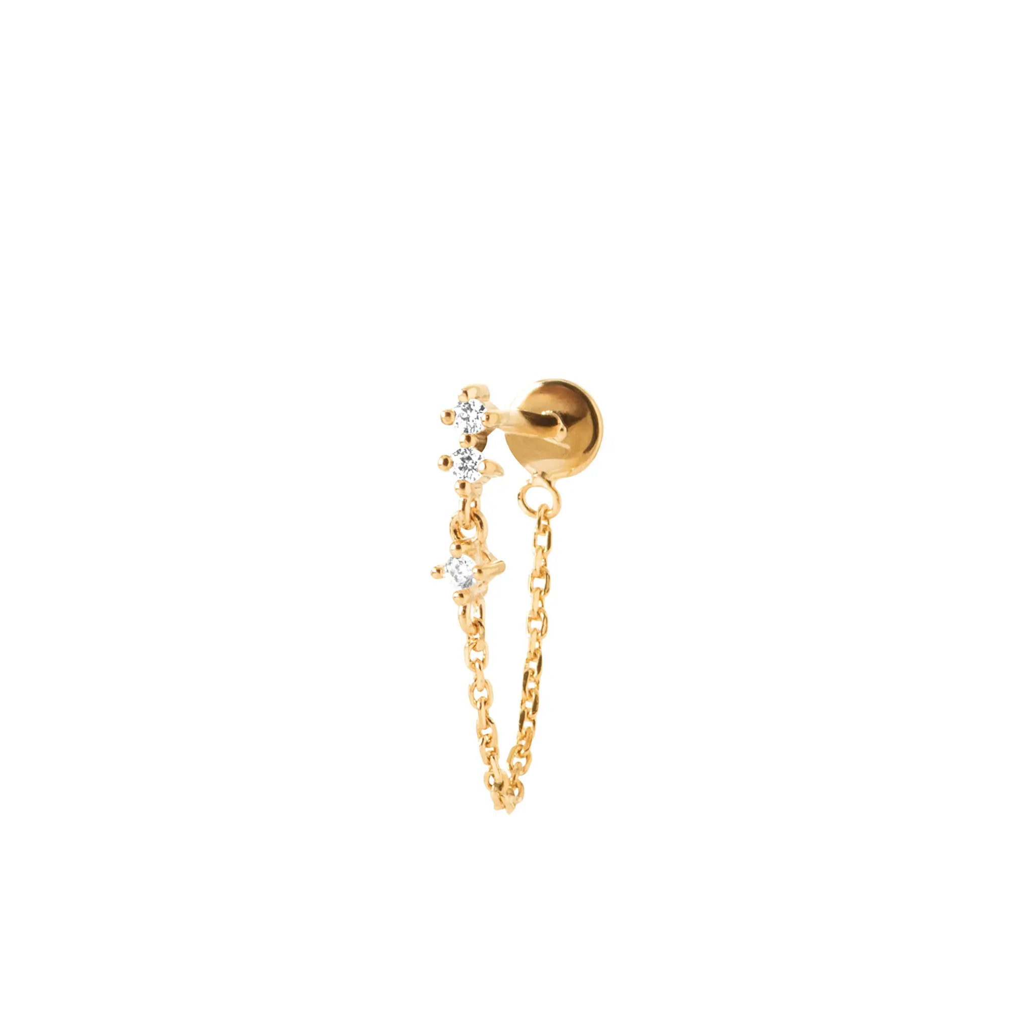Piercing con dos circonitas unidas a otra con cadena hasta el cierre.
