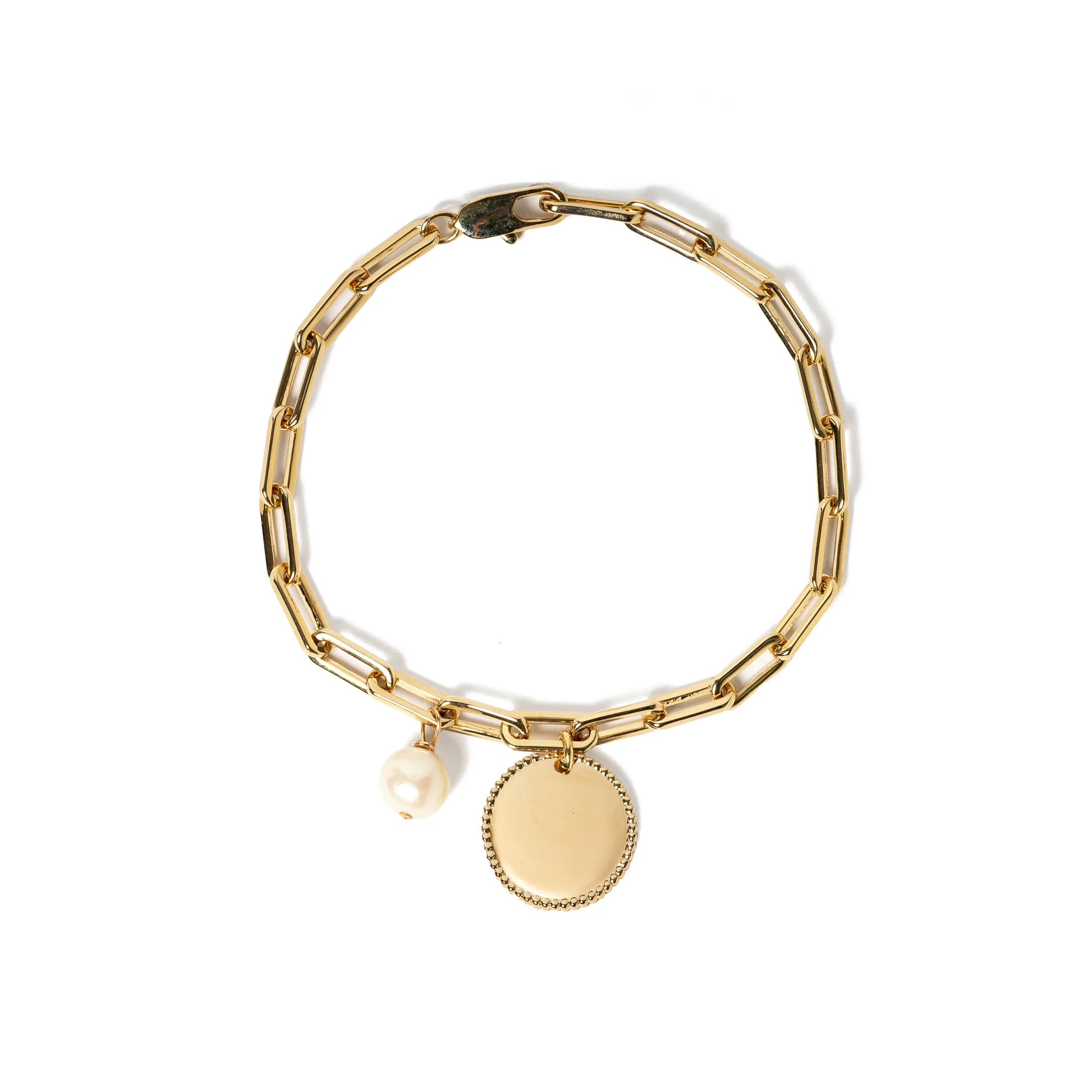La pulsera Victoria Pearls está formada por una cadena de eslabones gruesos ajustable de la que cuelga una placa de 20 mm adornada con bolitas y un charm de una perla cultivada.